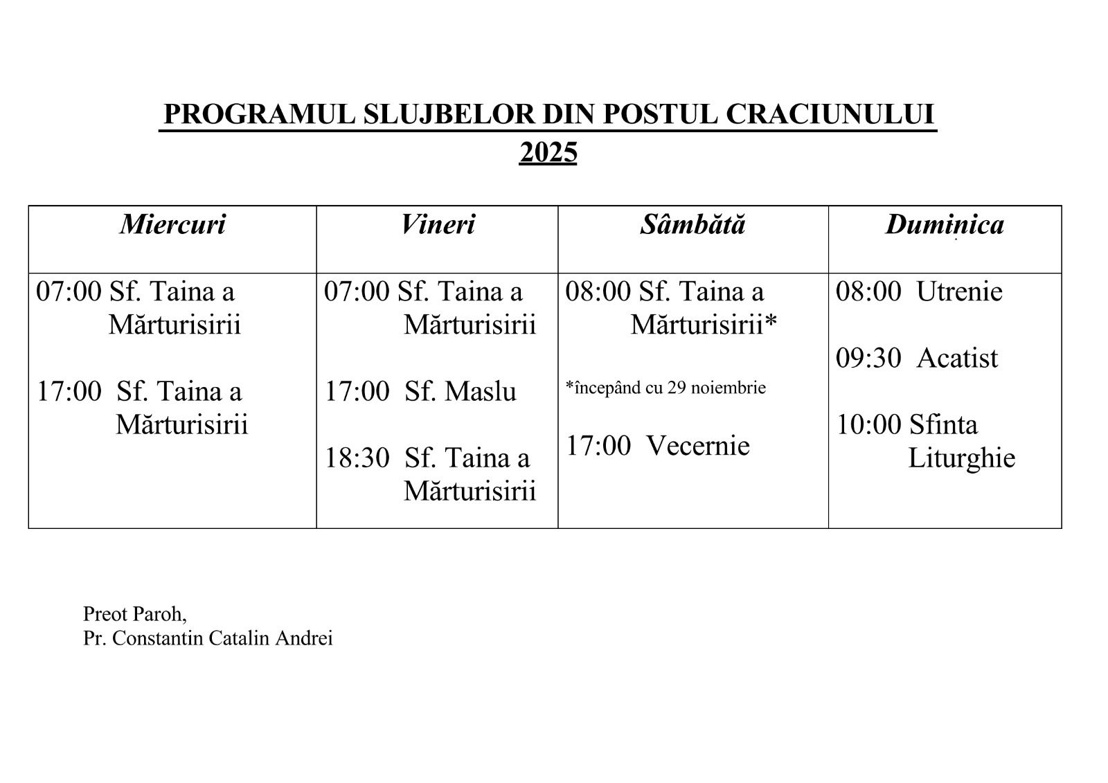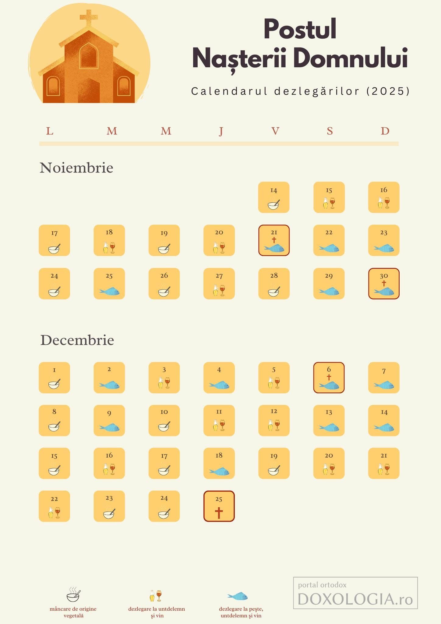 Postul Crăciunului este primul post din anul bisericesc și ultimul din anul civil. Anul acesta, Postul Crăciunului începe vineri, 14 noiembrie. Din rânduielile bisericești aflăm că se lasă sec în seara zilei de 14 noiembrie, însă, când aceasta dată cade miercurea sau vinerea, se lasă sec cu o zi mai înainte. Acest post se încheie pe 24 decembrie. Prin durata lui de 40 de zile, ne amintim de postul lui Moise de pe Muntele Sinai, când acesta aștepta să primească cuvintele lui Dumnezeu scrise pe lespezile de piatră ale Tablelor Legii. Astfel, creștinii postind 40 de zile, se învrednicesc să primească pe Cuvântul lui Dumnezeu întrupat și născut din Fecioara Maria.